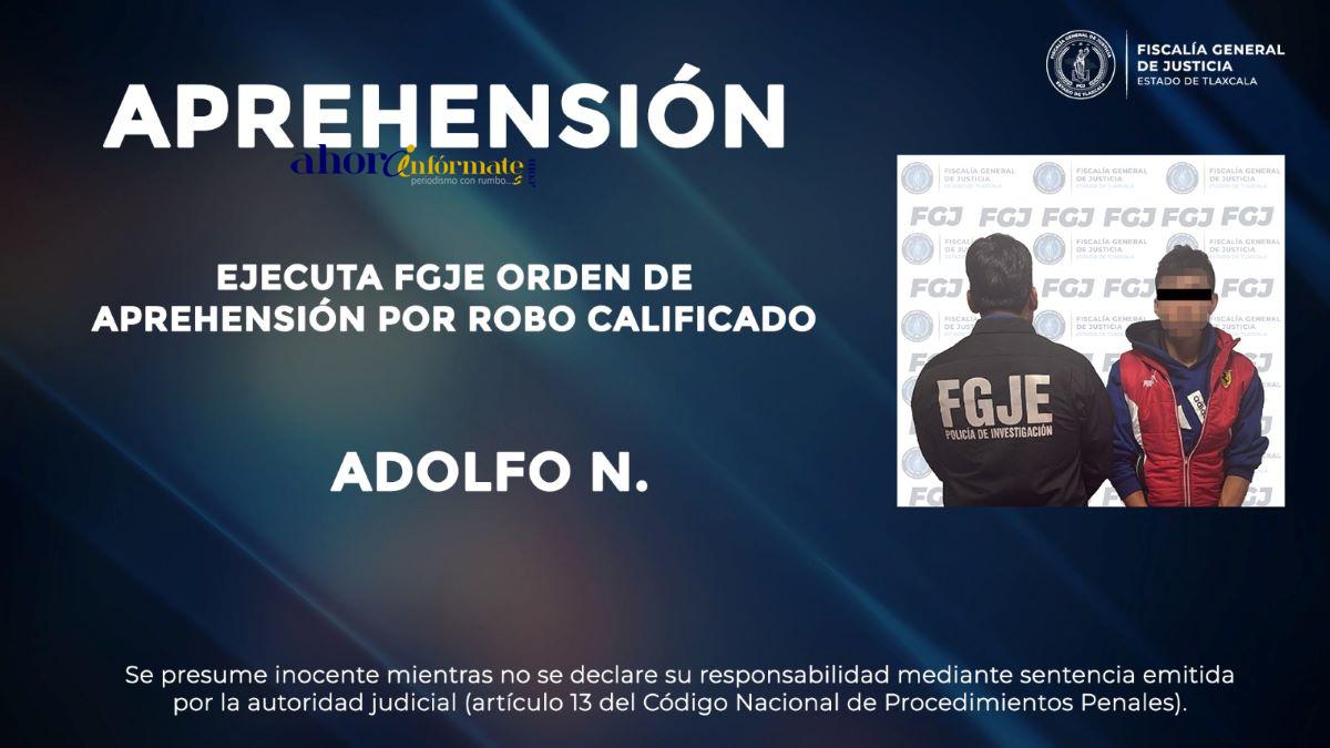 Agentes de la Policía de Investigación de la Fiscalía General de Justicia del Estado (FGJE) ejecutaron una orden de aprehensión en contra de Adolfo N., por el delito de robo calificado.