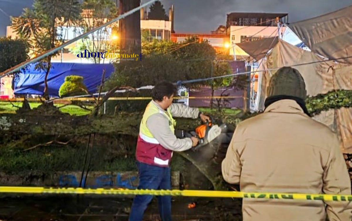 Tras la intensa lluvia registrada la tarde de este viernes en la ciudad sarapera, se reportó la caída de un árbol en el Parque Hidalgo. El incidente fue notificado por artesanos comerciantes del Tianguis Artesanal, instalado con motivo de la temporada de visitantes “Miguelitos”.