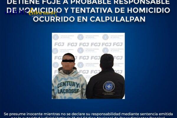 Los trabajos de inteligencia realizados por la Policía de Investigación de la Fiscalía General de Justicia del Estado (FGJE) permitieron la detención de Leonardo N., por los delitos de homicidio calificado y homicidio calificado en grado de tentativa, en agravio de una mujer y un hombre. Los hechos por los que fue detenido se registraron…